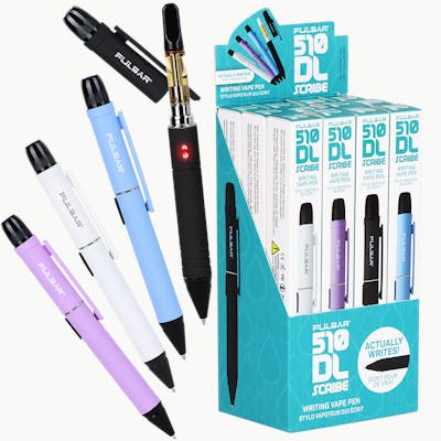 Let the ink (and the smoke) start flowing with the Pulsar 510 DL Scribe Vape Pen Battery! Whether you're a writer in need of a puff of the muse or a humble stoner seeking greater stealth, this vape pen is the perfect discreet multi-tool. This amazing vape pen can use 510 cartridges and works as a functional pen with refillable ink. Users can select between 5 preset voltage settings to prioritize rich flavors or huge clouds. Single-button operation makes this vape easy to use and the mouthpiece cap has a pen clip for convenient storage. Charge up quickly with USB-C charging. Available individually or as a 12-count assorted display. Multiple color options available.