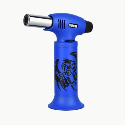 The Special Blue Torch Lighter - Inferno Model stands 6.25" tall and rests upright on its built-in base. This refillable butane torch features auto ignition, an adjustable flame and ergonomic design. This model works at any angle, refills quickly, is cordless and lightweight, and has a 2-year warranty from Special Blue that your customers will appreciate.