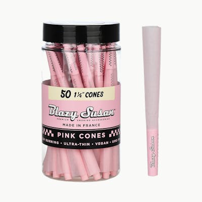 Add a floral flash of color to your next smoke sesh! These Blazy Susan Pink Pre-Rolled Cones are made in France with premium materials and a soft pink color. These delightful vegan-made cones deliver a slow burn with no papery aftertaste, and the pre-rolled shape allows users to pack it up and light it up with ease. Available in King Size Slim and 1 1/4" inch size. Sold as a 50-count jar. 50 cones per jar Blazy Susan pre-rolled cones Ultra thin pink paper Slow-burning Vegan & non-GMO