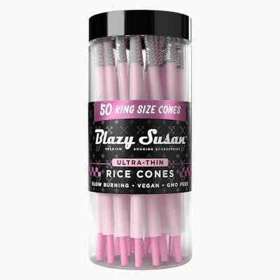 Prioritize the flavor of your customers' herb over the taste of paper with Blazy Susan's thinnest paper ever! These Blazy Susan Ultra Thin Rice Pre-Rolled Cones deliver a slow burn with the ultra thin rice paper leaving no papery aftertaste. The pre-rolled shape allows users to pack up and light up with ease. 50-count jar Pre-rolled cones Ultra thin paper Rice material The thinnest Blazy Susan paper ever! Slow-burning Vegan & non-GMO