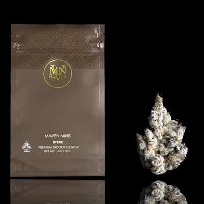 If you know, you know. FKAFL is a masterful, award-winning cross of our L.A. Rouge and The Soap, offering a flavor profile that is as complex as it is refined. The buds present a veritable feast for the eyes, with a multicolored plumy structure draped in a layer of white velvet Trichomes. Upon opening the jar, a sweet, inviting sensation of citrus and diesel entices the nose, deepening with each inhale. A fusion of subtle nuances similar to rosemary, red fruit and hints of cheese create a savory charcuterie-like experience; followed by a smooth, lavender-rich exhale that cleanses the palate. Like the classic pairing of fine wine with artisanal cheese, this sophisticated Hybrid is a true sensory delight and is ideal for those seeking a euphoric, indulgent sense of serenity. Whether you are an experienced connoisseur or a novice, Maven Minis offer the perfect balance of quantity and quality, delivering the same high caliber experience as our full-sized flower, but in a convenient and travel-friendly package. These compact 14g Mylars may contain smaller nugs - but don't be fooled by their size! Each bag is packed with the same nuanced, top-tier Maven Genetics strains you know and love.
