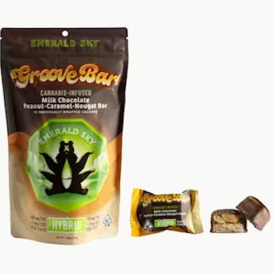 Emerald Sky, California's top chocolate brand, introduces the GrooveBar—a thrilling revival of a classic! This treat combines roasted peanuts, creamy caramel, rich nougat, and silky chocolate, all harmoniously infused with premium cannabis extract.