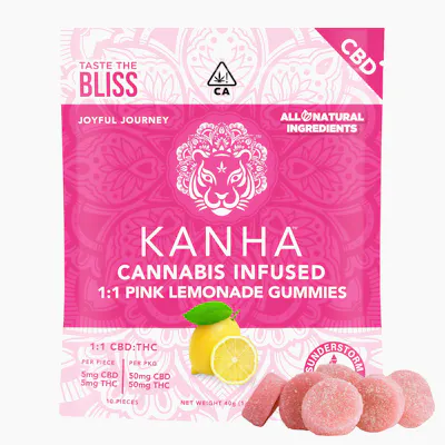 KANHA 1:1 Pink Lemonade CBD Gummies -- 100mg CBD x 100mg THC per bag -- Pink lemonade, a colorful circus-inspired spin on the summertime classic, finds the perfect balance of sweet, sour and tart in an always refreshing flavor. Our equally balanced 1:1 Pink Lemonade CBD offers 10mg each of THC and CBD paired with tasty terpenes like β-caryophyllene and α-humulene for consistently smooth and soothing experiences. This is the gummy of choice for winding down and enjoying the moment.