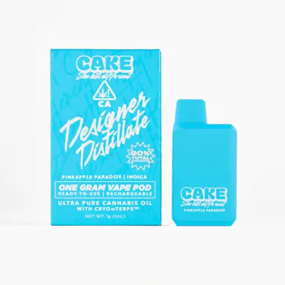 Introducing Designer Distillate by CAKE She Hits Different. Embark on an interstellar journey with our game-changing 1 gram all-in-one cosmic vape pod. 90%+ THC potency. Fits in the palm of your hand. Three designer colors. Transcend boundaries and experience the outer realms of style and potency. Pineapple Paradise [ Indica ] Tropical sun-kissed nectar. Natural sweetness perfectly balanced with a delicate touch of zest.