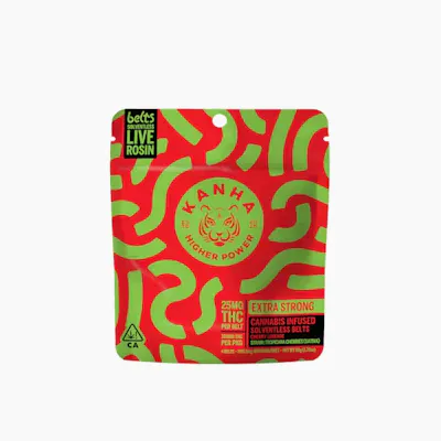KANHA NANO Sativa Cherry Limeade Solventless Live Rosin Belts 25mg THC per belt/100mg THC per package Zing into action with our Cherry Limeade Belts, a punchy Sativa blend crafted for the thrill-seekers. Made with Tropicana Cookies solventless live rosin for a zesty, cerebral effect. Instructions: Eat 1 serving. Onset starts around 5-15 minutes. Wait 60 minutes for full effect. Keep in a cool, dry place. Avoid temperatures over 75°F. Ingredients: Tapioca Syrup, Cane Sugar, Water, Gelatin, Agar, Locust Bean Gum, Citric Acid, Lactic Acid, Natural Flavor, Natural Fruit Concentrate, Natural Color, Carnauba Wax, Solventless Live Rosin Cannabis Oil, Malic Acid, VESIsorb Nanotechnology Servings: 20, Serving Size (2.5g), Amount per serving: Calories 7, Total Fat 0g, Sodium 0mg, Total Carb. 2g, Total Sugars 2g (incl. 2g Added Sugars)