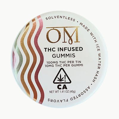 CBG: 0.01% | CBN: 0.02% | THC: 9.43mg | THC9: 9.39mg | THCA: 0.01mg/g -- OM Nonsolvent Ice Water Hash Gummis are vegan and gluten free. Assorted flavors of Strawberry, Mango, Passion Fruit, Apple, and Fruit Punch. 2O2O 1st place Emerald Cup. Each tin includes 10 pieces at 10mg THC each (100mg THC PER TIN). Ingredients: Sugar, Tapioca Syrup, Pectin, Ice Water Hash, Citric Acid, Flavoring, Sunflower Lecethin, Coconut Oil, Coloring.