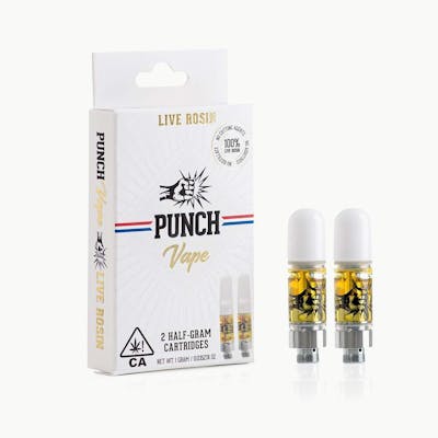 CBC: 10.93mg/g | CBG: 37.59mg/g | THC9: 75.98% -- 510 thread Punch Rosin Cart. Two Half Gram Carts in One. Reliable hardware specifically designed for Punch Live Rosin, Maintains the correct temperature to avoid burnt flavors. Premium Live Rosin, No Cutting Agent, No Additives, Perfect Consistency for optimum vaporization.