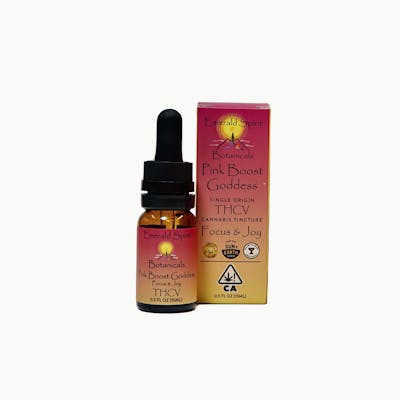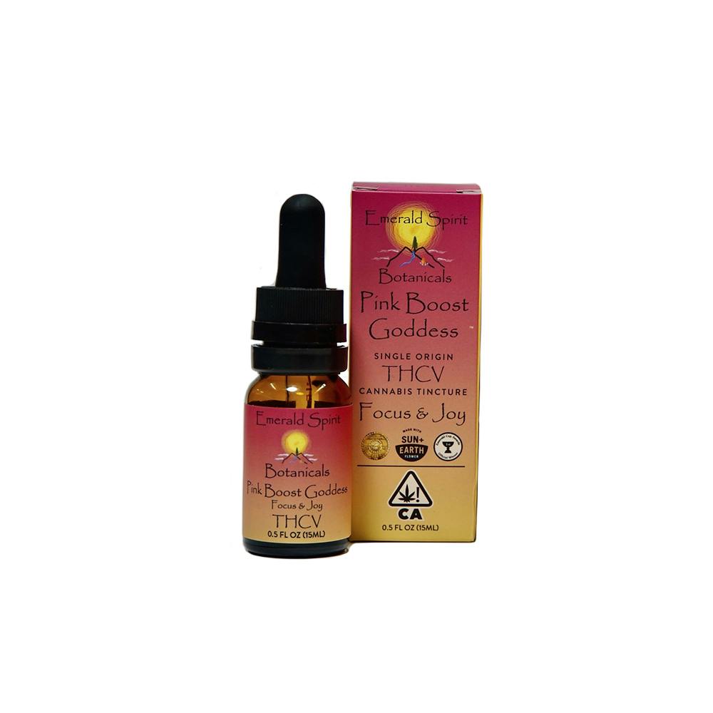 CBC: 0.01% | CBD: 0.02mg | CBG: 0.03% | CBGA: 0.02% | CBN: 0.01% | THC: 1.09mg | THC9: 1.09mg | THCV: 0.54% -- Bring Focus and Joy to your life with the Pink Boost Goddess Tincture from Emerald Spirit Botanicals. The tincture is a 1:1 ratio of THC & THCV and offers an uplifting, creative and joyful effect. Medicinal patients using Pink Boost Goddess have reported pain relief, appetite suppression, and improved energy levels. This .5oz 15ml bottle offers 150 mg of cannabinoids extracted using cryo-ethanol and infused in MCT Coconut oil. The graduated 1ml dropper allows for precision dosing starting at 2.5mg. Pink Boost Goddess is a 5x Gold Medalist at the California State Fair and 2024 Best Sungrown Flower in California. Made with Sun and Earth Certified cannabis flower grown by Emerald Spirit Botanicals in Mendocino County.
