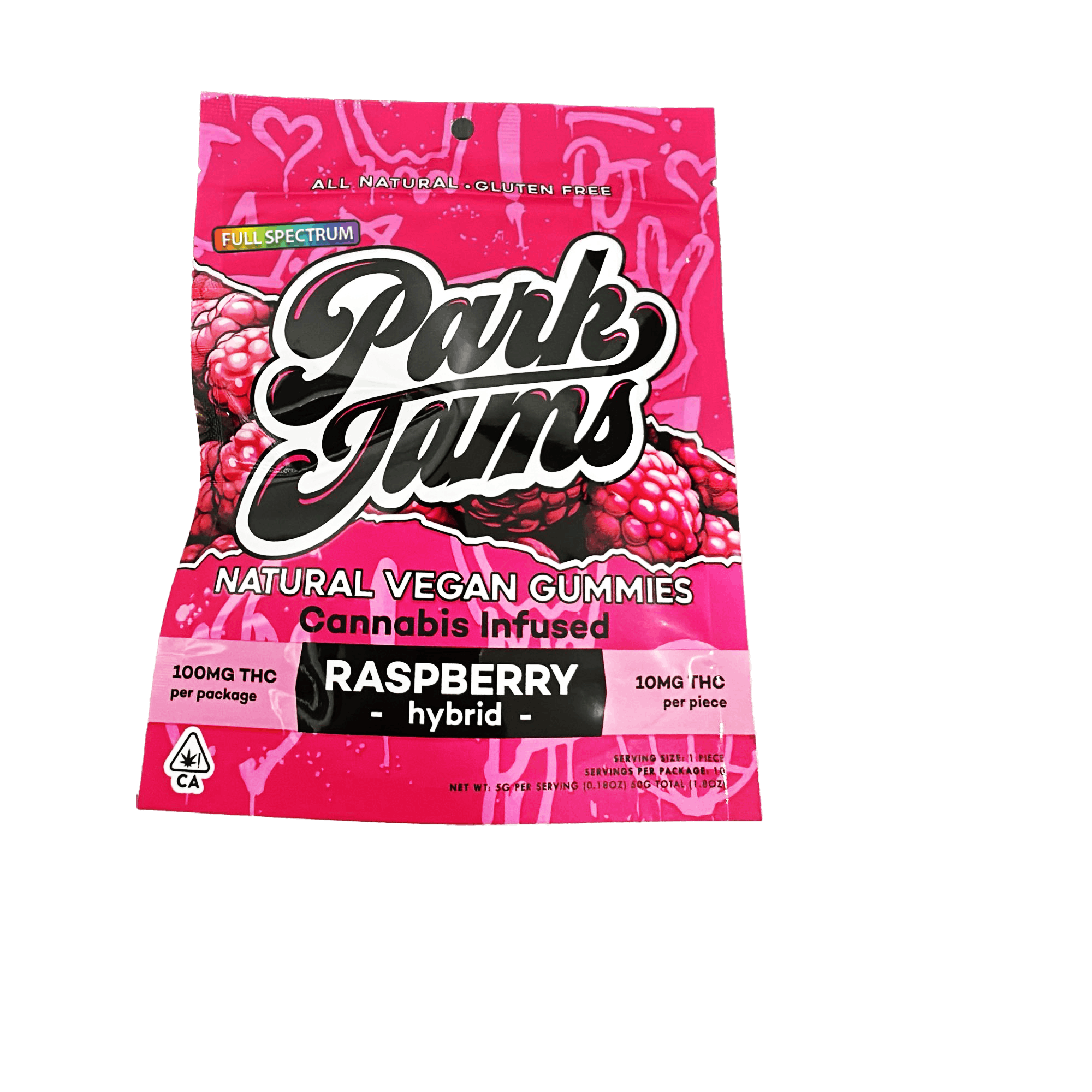 CBC: 0.02mg/g | CBG: 0.06mg/g | CBN: 0.03mg/g | THC8: 0.18mg/g | THC9: 0.18% | THCV: 0.97mg/g -- Park Jams gummies—where flavor meets the beat in every bite. Crafted with care and creativity, our natural, gluten-free, vegan gummies are infused with premium full spectrum cannabis extract, delivering a smooth and euphoric experience. Park Jams are more than just a treat; they're a vibe. Our raspberry gummies are where flavor meets rhythm in a harmonious explosion for your taste buds! Picture this: a gummy texture so smooth, it's like laying down fresh beats on a classic vinyl record. Each bite bursts with the intense, all-natural essence of ripe raspberries, transporting you to a summer jam session. Whether you're chilling at home or jamming at the park, these gummies are the perfect companion. So, grab a pack, turn up the volume, and let the flavor flow. It's time to elevate your groove with gummies that bring the flavor and the funk, jam on!