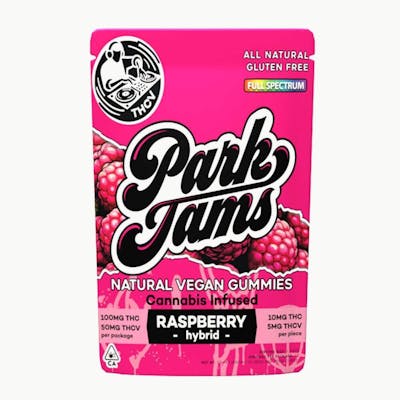 CBC: 0.02mg/g | CBG: 0.06mg/g | CBN: 0.03mg/g | THC8: 0.18mg/g | THC9: 0.18% | THCV: 0.97mg/g -- Park Jams gummies—where flavor meets the beat in every bite. Crafted with care and creativity, our natural, gluten-free, vegan gummies are infused with full-spectrum cannabis extract, delivering a smooth and euphoric experience. Park Jams are more than just a treat; they're a vibe. Our raspberry gummies are where flavor meets rhythm in a harmonious explosion for your taste buds! Infused with THCV, these gummies are your key to focus and flow, perfect for staying on your grind without the crash. A gummy texture so smooth, it's like laying down fresh beats on a classic vinyl record. Each bite bursts with the intense, all-natural essence of ripe raspberries, transporting you to a summer jam session. Whether you're chilling at home or jamming at the park, these gummies are the perfect companion. So, grab a pack, turn up the volume, and let the flavor flow. It's time to elevate your groove with gummies that bring the flavor and the funk, jam on! Be happy, know your ingredients and jam on – Park Jams are made with a combination of maltose syrup and sugar to give each gummy a balanced sweetness. The maltose syrup is made from rice—this gives Park Jams their rich and creamy texture without any dairy (is dairy usually a gummy ingredient?). We use citric acid from citrus fruits and grape extract for a hint of sour. Then we steal the cream of tartar from grandma’s cupboard to make sure Park Jams gummies stay perfectly soft—never chewy or crunchy. Then premium high potency cannabis oil, hybrid terpenes, and plant-extracted natural flavors are added to the mix, with purple carrot extract for color (and antioxidants!). No artificial flavoring and no toxic coloring, no unwanted hangovers here. We are California, we are art, we are loud. Sit back, relax, and jam on.