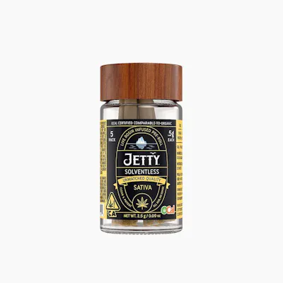 CBDa: 0.09% | THC: 32.06% | THC9: 1.43% | THCA: 34.92% -- Sweet meets sour in the best way. Strawberry Kush and Razzberry deliver that juicy, full-body calm, while Tropicana Cookies layers in zesty citrus energy that stays mellow, not racy. We start with OCal Certified (comparable-to-organic) top-shelf bud, selected for its flavor and potency. An infusion of live rosin comes next, made in-house using just ice, water, heat, and pressure. The result is unique pairings that bring out intense flavors and effects from complementary flower and hash terpene profiles. It’s a full-spectrum, full-body high that delivers. Top-shelf bud. Curated flower and oil pairings. Supercharged Potency. Find your flavor with Jetty Pre-Rolls.