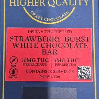 Strawberry Burst White Chocolate (Vegan & Dairy-Free) THC Type: Delta-9 Dosing: 50mg per bar (10 x 5mg pieces) Tasting Notes: Made with real freeze-dried strawberries for an authentic fruit-forward flavor. No artificial flavors or added colors. Ingredients: Organic cocoa butter, organic maple sugar, freeze-dried strawberries, organic sunflower lecithin, MCT oil powder, vanilla