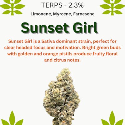 Sunset girl is a sativa dominant strain, perfect for clear headed focus and motivation. Bright green buds with golden and orange pistils producs fruity floral and citrus notes.