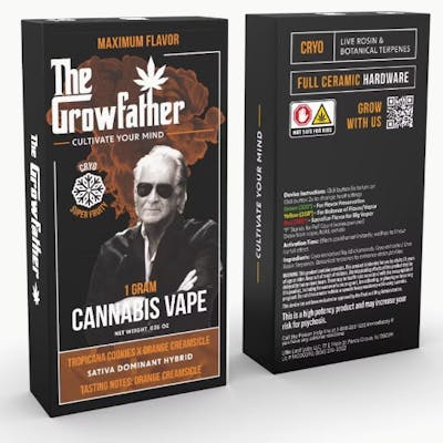 Get hit with pure nostalgia and fire flavor in every pull. The Orange Creamsicle Cryo Vape fuses the zesty citrus of Tropicanna Cookies with rich, creamy notes that taste just like a cold creamsicle on a summer day. It’s sweet, smooth, and citrusy, with subtle cookie undertones that round out the experience. This sativa-dominant hybrid is perfect for keeping your vibe elevated while treating your palate to maximum flavor. Formulated with live rosin and botanical terpenes, and powered by full ceramic hardware for clean, metal-free hits. Whether you’re sparking creativity or cooling off after a long day, this one’s built to chill and thrill. Highlights: • 1g Disposable Vape • Sativa-Dominant Hybrid | Tropicanna Cookies x Orange Creamsicle • Tasting Notes: Orange Creamsicle • Sweet Citrus • Cookie Finish • Live Rosin + Botanical Terpenes • Full Ceramic Hardware | No Metals • Powered by The Growfather