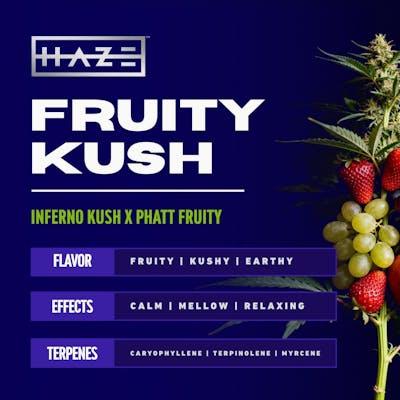 Sweet meets heavyweight. Fruity Kush throws ripe fruit flavor up front, then backs it with deep, earthy kush muscle from its Inferno Kush x Phatt Fruity lineage. This indica-leaning hybrid moves slow and confident — calm, mellow, and fully grounded without feeling stuck. Thick, kushy flavor and a smooth, settling presence make this the one you reach for when you want to turn the volume down and let the moment sit heavy in the best way.