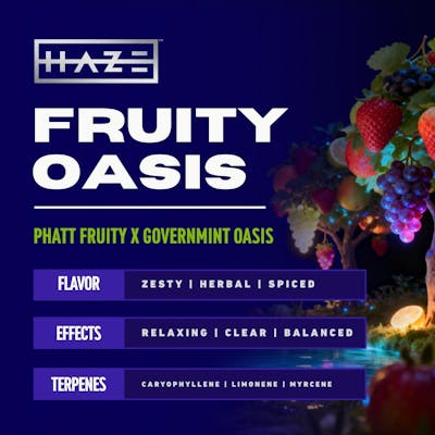 Escape in every hit. Fruity Oasis brings bright citrus peel, soft fruit notes, and a thread of herbal spice, shaped by its Phatt Fruity x GovernMint Oasis lineage. The feel is smooth and even, settling into a relaxed, clear headspace that stays balanced from start to finish. Not heavy, not racy — just steady, flavorful, and easy to reach for when you want something that keeps the mood level and the moment moving.