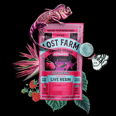 Lost Farm gummies are strain-specific, plant-based edibles infused with 100% live resin to preserve the natural terpene and cannabinoid profile of the cannabis plant. The Raspberry flavor is paired with an indica live resin profile, delivering a true-to-the-plant experience with layered flavor and effects. This formulation features bright raspberry sweetness balanced by subtle earthy and pine notes, reflecting the character of the live resin used. Each pack includes ten gummies dosed at 10mg THC each for a consistent, measured experience.