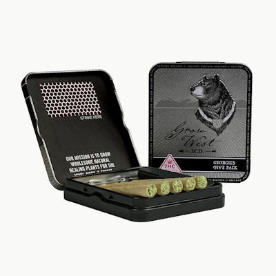 Our signature Georgies pre-rolls are expertly crafted with strain-specific whole buds, never shake and trim, to preserve moisture. The cylindrical design offers radial compaction to create an even burn that pulls smooth like fresh mountain air. Each container holds five half-gram (.5g) pre-rolls