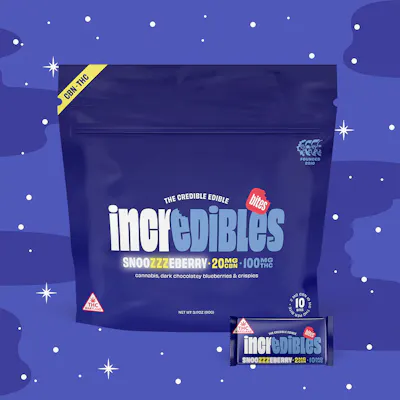 Crunchy rice crispies, dark chocolatey blueberries, snores galore. Snoozzzeberry chocolate offers 5mg THC and 1mg CBN per serving; 20 servings. Made with pure THC distillate in a homogeneous mixture to ensure accurate dosing and consistency. Onset is between 45 minutes to an hour and a half.