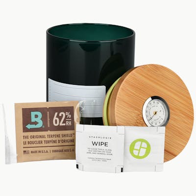 SmartJar storage jar Humidity sensing Analogue hygrometer Bamboo lid Includes 62% Boveda Pack Opaque exterior Holds up to 2 ounces of dry herbs Extra Large size - 6 inches by 4.5 inches