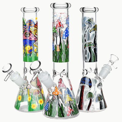 The Shrooms Are Watching Glow Glass Beaker Water Pipe features a beaker style pipe body with a slitted downstem diffuser and a funnel style herb slide with a handle. These durable borosilicate glass water pipes are decorated with fully wrapped decals depicting beautiful, cosmic, and gnarly mushrooms, and they also have a 3 pinch ice catcher for rapidly cooling smoke. Measures 10 inches (25.4cm) tall. Designs vary. Glow in the dark accents.