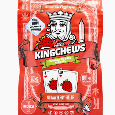 Discover the unmatched quality of Kingpen, now available in our all-new Kingchew gummies. Crafted with the same award-winning, strain specific oil that powers Kingpen, Kingchews deliver the perfect fusion of potency and taste. Each bite is bursting with flavors inspired buy our award-winning Kingpen strains, providing you with a delicious and effective experience every time. Strawberry Fields is a lush, flavor-forward Indica that blends the best of its celebrated lineage: Strawberry Banana and Tangie. This cultivar delivers a rich, ripe strawberry aroma up front, layered with creamy banana sweetness and finished with a bright citrus twist from its Tangie roots. The flavor mirrors the nose—smooth, fruity, and refreshingly sweet with a hint of orange zest on the exhale. True to its Indica nature, Strawberry Fields offers a deeply relaxing, mellow experience that’s perfect for unwinding at the end of the day. Expect a calm, body-focused vibe paired with a gentle mental ease, making it an excellent choice for evenings, downtime, or simply settling into a laid-back mood. With its dessert-like profile and soothing effects, Strawberry Fields is a go-to for those who appreciate bold fruit flavors wrapped in a classic Indica experience. Ingredients: Light Corn Syrup (corn syrup, salt, vanilla extract (vanilla beans, water, ethyl alcohol)), Cane Sugar, Water, Malic Acid, Pectin Mix (dextrose, pectin), Natural and/or Artificial Flavor, Cannabis THC Distillate, Sodium Bicarbonate, Natural Color (fruit juice and vegetable juice).