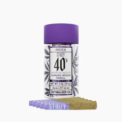Elevate your pre-roll game. Stiiizy 40s pre-rolls are setting the standard with high potency, cannabis infused joints coated evenly with kief. Using our proprietary live resin infusion methods, we’ve designed every pre-roll to offer 40%+ THC potency with a unique flavor profile. With a smooth inhale and tasteful exhale, each and every Stiiizy 40 is packed with indoor grown flower, specifically made to ensure a potent and long-lasting high. Spark up the 40s. An Indica dominant hybrid, Skywalker OG is for those looking to completely separate from the aches, pains, and stress they are under. Because of the heavy indica effects, it's a great companion for a night on the couch.