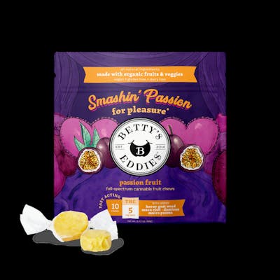 Take Betty’s into the bedroom with Smashin' Passion! Infused with a blend of full-spectrum cannabis and natural aphrodisiacs, including horny goat weed, maca root, damiana & muira puama, these passion fruit chews are a sweet and romantic treat for you and yours. Chews passion, get pleasure! Betty's Eddies™ handcrafted fruit chews are made with all-natural ingredients and a whole lotta love. We use organic fruits & veggies, full-spectrum cannabis, supporting cannabinoids, and herbal supplements & vitamins to help you feel your Betty best no matter what life throws at you. Life is better with Betty’s.