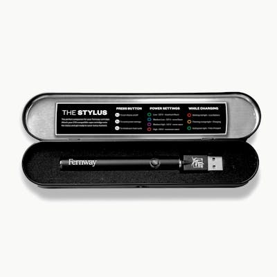 An excellent vape deserves an excellent battery. Optimized to make your vapes taste better and last longer, the STYLUS is the perfect companion for your Fernway cartridge. Instructions Click button 5x fast to turn on & off Click button 3x fast to change heat setting Click button 2x fast to preheat in cold weather or if cartridge clogs; wait for lights to cycle through, then press button & inhale Heat settings: Low (Green, 2.8V), medium low (Blue, 3.0V), medium high (Purple, 3.4V), high (Red, 3.8V) Low means max flavor/min vapor, high means max vapor/min flavor Don't forget to register your battery for your 2 year warranty!
