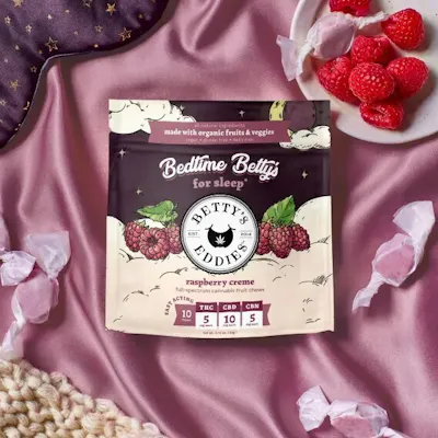 1:2:1 5mg THC, 10mg CBD, 5mg CBN | 10 Pieces per package | Fast Acting | Vegan | Gluten Free | Dairy Free | Taffy Tired of being tired? Betty's got your back. Our newly formulated Bedtime Betty's recipe infuses a dreamy blend of THC, CBN, and CBD into raspberry creme chews, which may aid in a night of deep sleep. Betty knows best, invest in good rest. CBD: We love CBD for sleep because it lowers anxiety levels to help you avoid counting sheep. Chews Betty’s for CBDeep sleep! CBN: Sleepy, sleepy CBN is the (non-psychoactive) dream cannabinoid for falling asleep fast & staying asleep!
