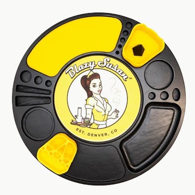 The Blazy Susan Spinning Rolling Tray features an innovative design with small compartments for all different types of smoking accessories and supplies including lighters, pre rolls, bangers, your cell phone, and more. Give it a spin – your coffee table will never be the same! Includes: 1 x Blazy Susan Rolling Tray 1 x Colored Insert 1 x Blazy Susan Dab Pad 1 x Deluxe Silicone Ashtray / Bowl Cleaner 1 x Silicone Dab Station Specs: Tray Size: 16" x 16" x 2" Silicone Slap Insert Size: 9.25" x 3.3125" x 0.0625" Blazy Dab Pad Size: 8" x 8" x 0.05" Deluxe Silicone Ashtray / Bowl Cleaner Size: 3.375" x 3.1875" x 2.750" Dab Station Size: 3.4375" x 3.125" x 1.875" Weight: 3.6875 lbs Material: Birch Wood or Cherry Wood