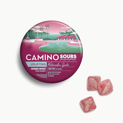 Watermelon Spritz Sour - Uplifting 5mg THC Per serving | 20 Servings per package | Vegan Find yourself the life of the party as energizing, sativa-like terpenes meet sharp, juicy watermelon flavors for a splashy sweet that will leave you feeling refreshingly enlivened. Terpenes: Alpha-Pinene, Beta-Caryophyllene, Limonene, Linalool