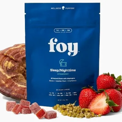 Elevate your nightly routine with a healthier alternative that surpasses the standard gummy. Foy Nighttime vegan soft chews are consciously formulated with authentic non-GMO fruit purées, delicately coated in powder derived from natural strawberries, and enriched with a potent adaptogen blend of USDA Certified Organic Reishi mushroom, USDA Certified Organic Valerian Root, and USDA Certified Organic Chamomile. These CO2-extracted, CBN-enriched chews are specially designed to promote optimal sleep quality and help reestablish a harmonious, restful sleep pattern. With 5mg of THC, 5mg of CBD, and 5mg of CBN per chew, Foy Nighttime Chews offer an unparalleled 300mg of total cannabinoids, elevating your nighttime routine to bring you the gift of rejuvenating slumber.