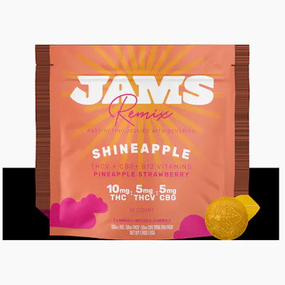 Wake up and find a joyful flow - JAMS Remix Shineapple Fast-Acting Jellies with Benefits help you slay the day. Bite into a bold pineapple strawberry flavor for a sense of bubbly euphoria from the benefits of fast-acting THC, THCV, CBG, and B12. Start your day smiling and wake up on the Shineapple side of things. Each fast-acting ratio jelly contains 10mg THC, 5mg THCV, 5mg CBG with 10 jellies per pack.