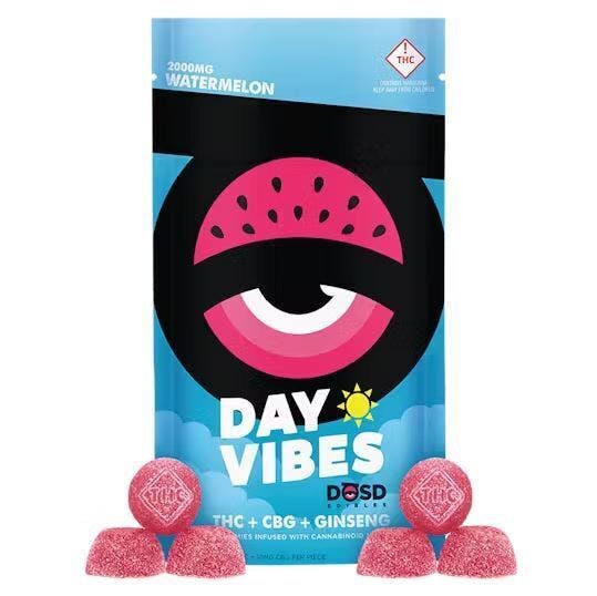 DAY VIBES Nano Bites - Watermelon Flavored Gummies infused with Water-Soluble THC & CBG Cannabinoid Nanoparticles + Ginseng Average Onset: 15-25 minutes What are THC Nanoparticles? Our DAY VIBES Nano Bites contain cannabinoid nanoparticles made from ultra-refined cannabis extract, and are utilized by the body much more efficiently than unrefined oils. With increased bioavailability of THC & CBG, you can expect more out of your dose...with far less waiting. #AreYouDOSD
