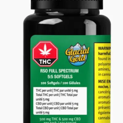 Glacial Gold RSO Full Spectrum 5:5 Softgels deliver a balanced blend of 5mg THC and 5mg CBD in each premium softgel. Organic hemp oil is infused with RSO cannabis extracts, delivering an all-cannabis formula that’s consistent and convenient.