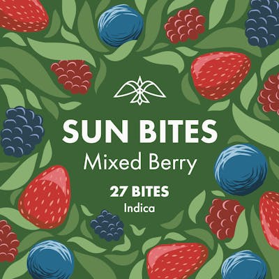 Mixed Berry Indica Sun Bites 550mg | 27 pack Mixed Berry Indica Sun Bites have a fresh, jammy flavor. Infused with CO2 Extracted Indica Cannabis Oil: Firelands Scientific's CO2 Cannabis Oil is created from our greenhouse grown plants through a clean extraction process that retains much of the plant's original phytochemical profile giving patients the results they’re seeking. 20mg THC in each Bite for a consistent experience. Patients have reported increased relaxation, pain relief and appetite stimulation. Vegan Gluten-Free All-Natural Ingredients, No Artificial Flavors