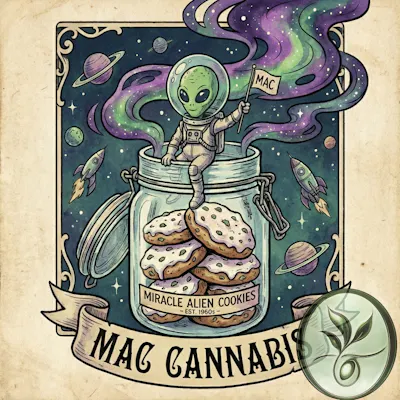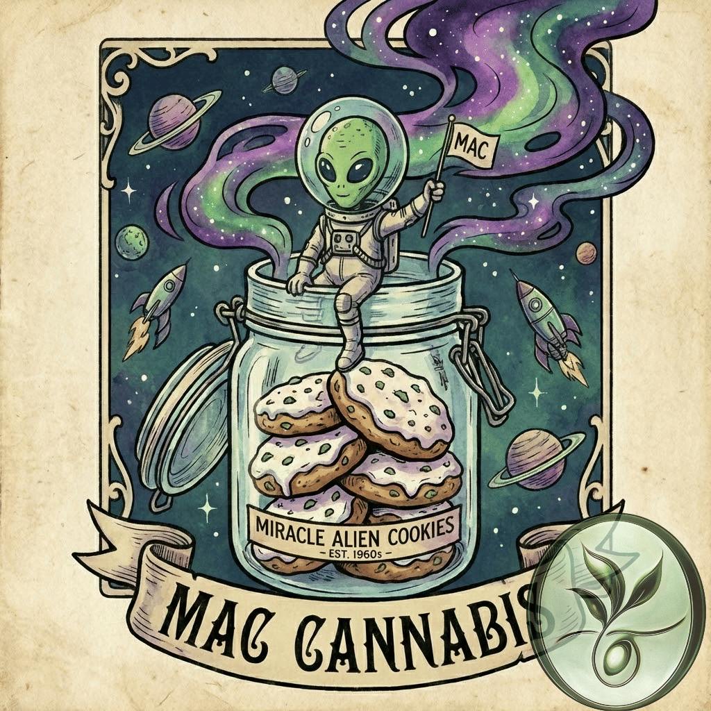 The MAC strain, short for Miracle Alien Cookies (often referred to as MAC 1), is a popular, high-potency balanced hybrid known for its vibrant appearance, complex citrus and diesel aroma, and deeply euphoric effects. It offers a unique blend of cerebral stimulation and physical relaxation. Strain Profile: -Genetics: MAC was created by the breeder Capulator by crossing Alien Cookies with a hybrid of Colombian (a Sativa landrace strain) and Starfighter strains. The original male plant used was the sole survivor of a batch of seeds that went through a washing machine, leading to its "miracle" name. -Appearance: The buds are dense and chunky, often displaying deep green, purple, and blue hues. They are notably "frosty," covered in an abundant, thick layer of sticky, white trichomes that hint at its potency. -Aroma & Flavor: The aroma is a complex mix of sour, citrusy orange and lemon notes balanced by pungent, musky, and earthy diesel undertones. The flavor is smooth and creamy, with hints of vanilla, spice, and a sweet finish on the exhale. -THC Content: This is a potent strain, with THC levels typically ranging between 20% and 25%, and some phenotypes testing even higher, sometimes over 30%. Effects and Medical Uses: -MAC is celebrated for its balanced effects that can be enjoyed throughout the day, providing both mental clarity and physical calm. -Primary Effects: Users report an initial wave of euphoria, happiness, and enhanced creativity, making it ideal for artistic projects or social interactions. This is followed by a gentle, soothing body relaxation that eases tension without causing heavy sedation or "couch-lock". -Potential Medical Uses: Medical marijuana patients often choose MAC to help relieve symptoms associated with anxiety, chronic pain, depression, and stress. Its ability to boost mood and focus also makes it a potential aid for those with chronic fatigue or attention disorders. -Dominant Terpenes: The most abundant terpene in MAC is Limonene (contributes citrus notes and mood elevation), followed by Pinene (pine aroma and mental alertness), and Caryophyllene (spicy, peppery notes and anti-inflammatory properties).