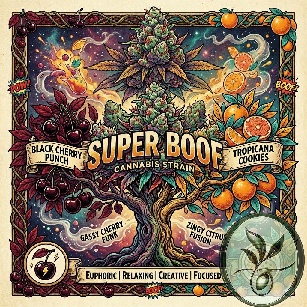 The Super Boof strain (also known as "Blockberry" or "Superboof") is an award-winning, balanced hybrid known for its high potency and distinctive flavor profile of citrus and cherry. It provides an ideal blend of uplifting cerebral effects and gentle physical relaxation, making it versatile for any time of day. Strain Profile: -Super Boof has gained significant popularity for its unique characteristics and reliable effects, earning the title of Leafly's Strain of the Year for 2024. -Genetics: It is an evenly balanced hybrid created by crossing Black Cherry Punch with Tropicana Cookies. -Appearance: The strain features dense, chunky, heart-shaped buds with deep green and purple hues. They are notably "frosty," covered in a thick layer of crystalline trichomes and bright orange or red hairs. -Aroma & Flavor: The aroma is loud and complex, dominated by strong notes of tangy orange zest, sweet cherry, and other tropical fruits, with subtle earthy, nutty, or diesel undertones on the exhale. -THC Content: This is a potent strain, with THC levels typically ranging between 20% and 32% or higher in some lab results, making it better suited for experienced consumers. Effects and Medical Uses: -Super Boof is valued for its versatility, offering a functional high that enhances mood and creativity without heavy sedation. -Primary Effects: Users report an immediate wave of euphoria, happiness, and giggles, followed by a boost in focus and creativity. A light, soothing body relaxation accompanies the mental lift, easing tension without causing couch-lock. -Potential Medical Uses: It is frequently used by medical patients to help manage symptoms of stress, anxiety, depression, chronic pain, and gastrointestinal disorders. -Dominant Terpenes: The most common terpenes found are Myrcene (earthy, relaxing notes), Limonene (citrus, mood-boosting), and Caryophyllene (spicy, anti-inflammatory properties).