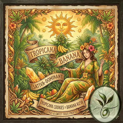 Tropicana Banana (sometimes called Tropicanna Banana) is a flavor-focused, sativa-dominant hybrid (60% sativa / 40% indica) created by Barney's Farm. It is highly regarded for its "vacation-in-a-bag" vibe, blending energizing mental clarity with a smooth, tropical sensory experience. Strain Profile: -Genetics: A cross between the citrusy Tropicana Cookies and the creamy Banana Kush. -Potency: Typically features a high THC content, averaging around 22% to 25%, with some premium batches testing up to 28% or more. -Aroma & Flavor: True to its name, it smells like a creamy piña colada with notes of ripe banana, tangy tangerine zest, and honey. The flavor is a mix of sweet tropical fruit and sour citrus with an earthy, spicy finish. -Appearance: Known for producing dense, bulbous buds that are bright green, often with purple undertones and a heavy coating of sparkly trichomes. Effects and Medical Uses: -Tropicana Banana offers a layered high that begins with mental stimulation before settling into physical comfort. -Primary Effects: Users report an almost immediate euphoric head rush and a sense of focused energy and creativity. As the high progresses, it eases into a soothing body relaxation that is mellow but not typically sedative. -Medical Applications: Often sought for relief from chronic fatigue, depression, stress, and anxiety. It may also help with chronic pain and appetite stimulation. Dominant Terpenes: -Pinene: Provides an earthy, herbal scent and supports mental focus and alertness. -Limonene: Contributes to the intense citrus aroma and is associated with mood elevation and anti-anxiety effects. -Caryophyllene: Adds a touch of spice (pepper/clove) and offers potential anti-inflammatory benefits