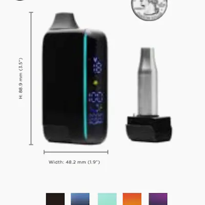 • Variable Voltage: One Button Click • 1.8V to 4.2V • Battery: 1000mAh • Charging: Type-C (Cord NOT Included) • Capacity: Up to 2g Cartridges or 14.5mm wide • Pre-Heat Function: Yes, 2 Button Clicks • Display: Digital Tube Screen • Voltage Level • Battery Indicator • Pre-Heat Indicator • Puff Counter • 5 Button Click ON/OFF • Magnetic Removeable Silicone Mouthpiece Includes: 1 x Cartisan Veil Bar Pro EVO Device 1 x Cartisan Bullet Wax Atomizer EVO *Charging Cable NOT included*