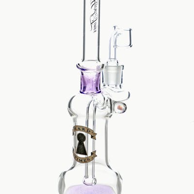 The Hard Times 9" Purple Straight Rig is a sleek and compact rig. The mouth rim, neck joint, and base have a contrast purple glass detail. Hard Times decals are featured on the neck and chamber. The chamber has an opal marble to allow for a better grip.