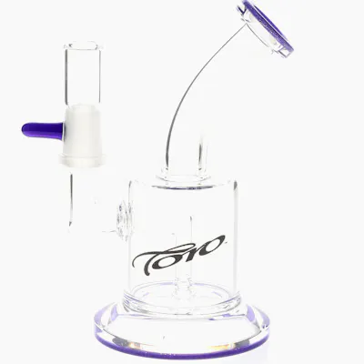 Hand blown, 5.5" tall Toro Big Macro rig with indigo coloured accents on foot and mouth piece. Made in USA. Fits 14mm, 90 degree, female banger. Banger not included.