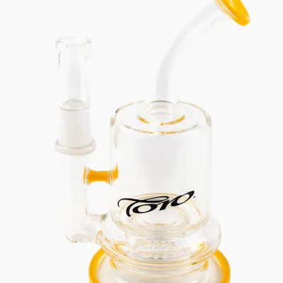 Hand blown, 6.5" tall Toro Big Macro rig with yellow coloured accents on foot and mouth piece. Made in USA. Fits 14mm, 90 degree, female banger. Banger not included.