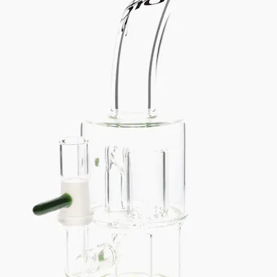 Hand blown, 8.5" tall Toro Double Micro bong with 2 froth percolators and a combo colour of Mighty Mucus and Slyme accents on foot and mouth piece. Made in USA. Fits a 14mm Female banger. Banger not included.