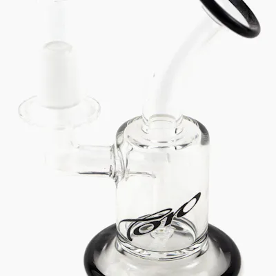 hand blown, 5.5" tall Toro Single Macro rig with black coloured accents on foot and mouth piece. Made In USA. Fits a 14mm, 90 degree, female banger. Banger not included.