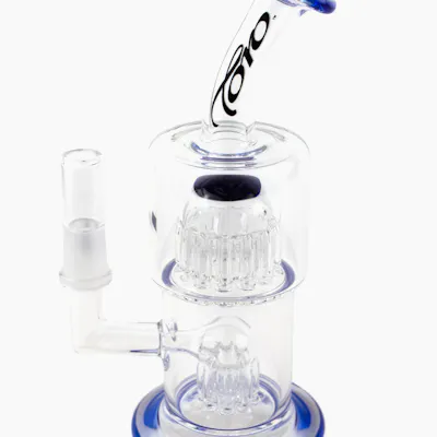 Hand blown, 8" tall, extra large Toro Macro bong with two tree percolators and bipolar, blue and white colouring on foot and mouth piece. Made in the USA. Fits a 14mm, 90 degree, female banger. Banger not included.
