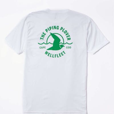Super comfy, soft lightweight white t-shirt featuring the Piping Plover logo in green on both sides.