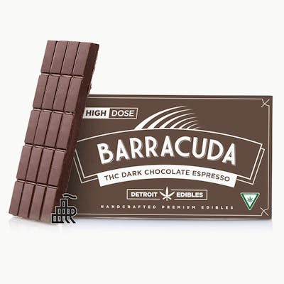 Coffee lovers rejoice. Barracuda Dark Chocolate Espresso Bars are made from deliciously smooth dark chocolate combined with rich espresso flavors and the purest distillate from our very own Michigan-made Cannalicious Labs for the smoothest consumption experience to date. Dark Chocolate Espresso 200mg THC Fully activates in 1-2 hours Ingredients: Semisweet Chocolate (Sugar, Chocolate Liquor, processed with Alkali, Cocoa Butter, Milkfat, Soy Lecithin, Vanillin, Natural Flavors), Dark Cocoa Wafers (Sugar, Fractionated Palm Kernel Oil and Hydrogenated Palm Oil, Cocoa Powder, Nonfat Dry Milk, Milkfat, Soy Lecithin, and Vanillin), Espresso Flavor (Organic Sunflower Oil and Natural Flavors), Cannabis Extract. Contains milk and soy.