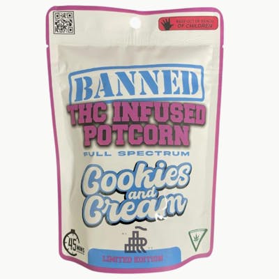 Banned Cookies and Cream Potcorn 200mg is a decadent THC-infused popcorn treat coated in creamy white chocolate and cookie crumbles. Its potent dose delivers a long-lasting euphoric high paired with deep, soothing relaxation.
